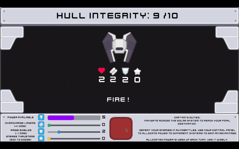 T.S.V. Aegis is a sci-fi auto-battler where you command the Tactical Support Vehicle Aegis through a gauntlet of encounters, making tough calls with limited energy. Each encounter, choose how to allocate your ship’s power into it's core defence systems, and let the combat play out automatically based on your setup.